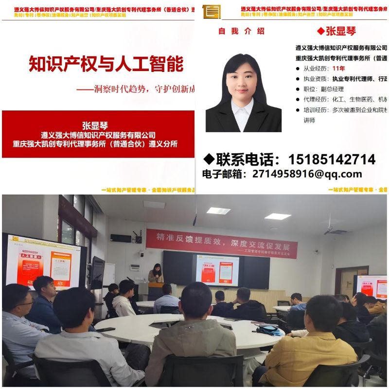 4月24日下午,学校特邀重庆强大凯创专利代理事务所遵义分所副总经理张显琴开展主题培训。张显琴以“AI重构知识产权价值链”为切入点,深度解析国家“人工智能+”战略下专利挖掘、侵权预警及商业秘密保护策略,结合茅台学院AI酿酒专利集群建设案例,揭秘“从实验室到生产线”的转化密码。